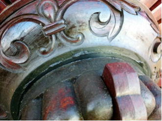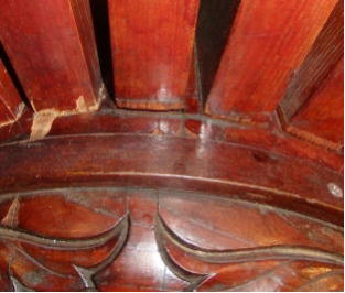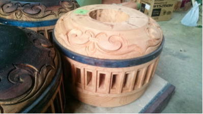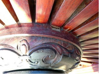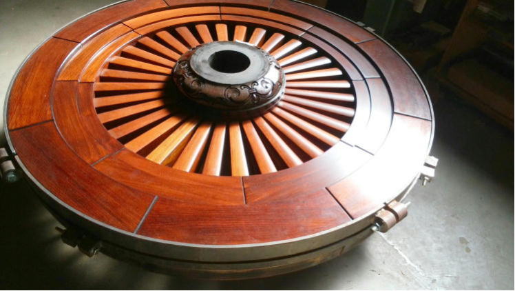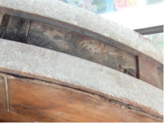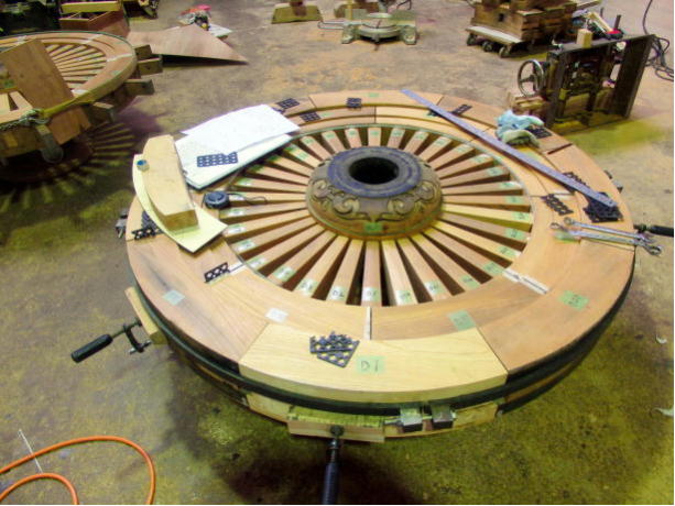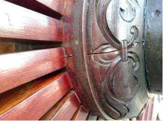 現在の車輪は、昭和27年に新調されたもので、この作は、井波の「久村角平の作」であり、寸法は、径153㎝・厚さ18㎝であります。平成27年10月に「車輪中心部などに割れが発生」し、翌年28年9月に藤岡寺社建築に全面修理を依頼する。